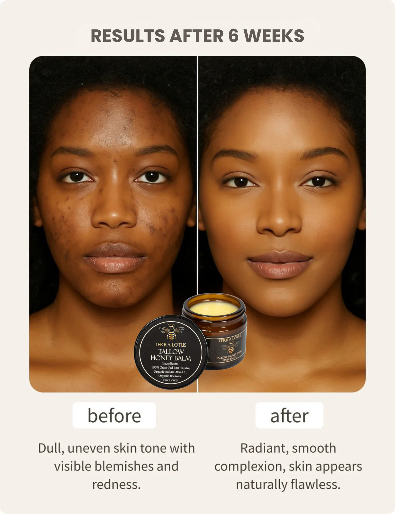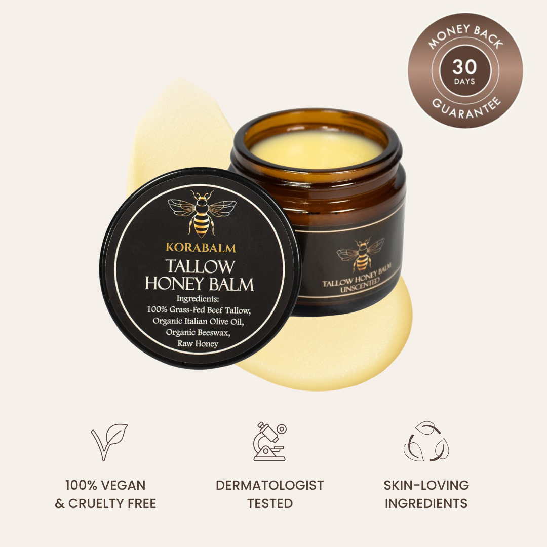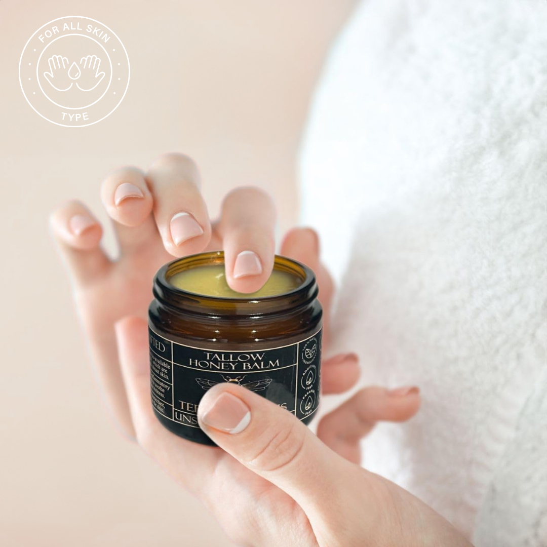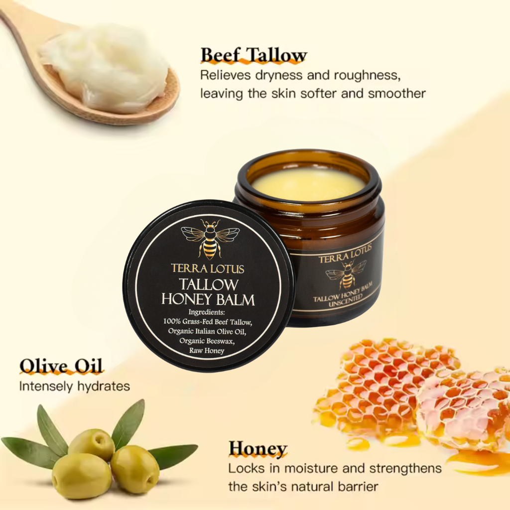 Made with just four ingredients: grass-fed beef tallow, organic olive oil, raw honey, and essential oils, it gently supports your skin’s natural barrier instead of destroying it.